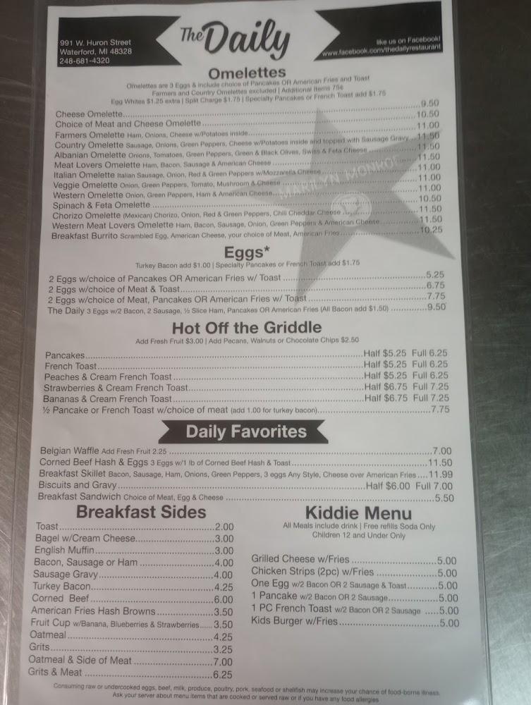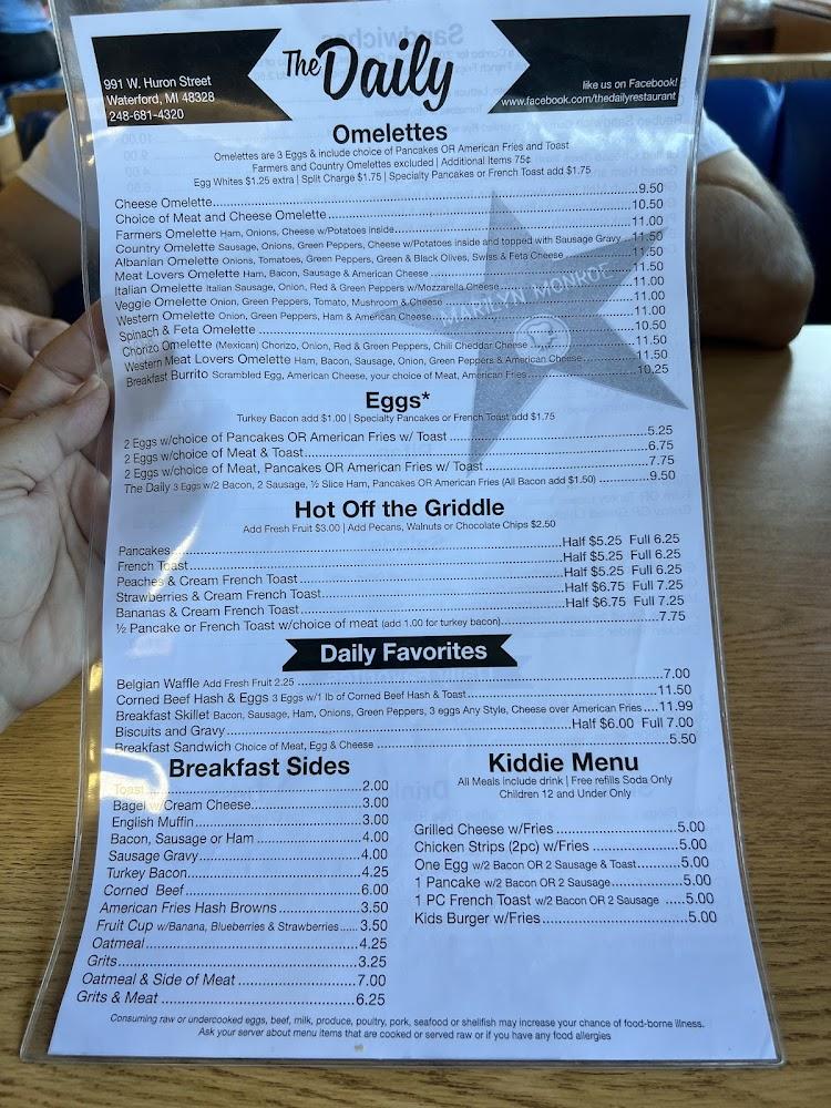 Welcome to The Daily Diner, your go-to spot in Waterford Township for hearty breakfasts, satisfying lunches, and delicious dinners. Enjoy a simple, friendly atmosphere where big portions and daily specials keep our guests coming back for more. Whether you're craving excellent coffee, delectable desserts, or local specialties, we have something for everyone. Our diner is accessible and family-friendly, making it the perfect choice for groups or solo diners alike. Join us for a casual meal, take advantage of our takeout and delivery options, or relax with free Wi-Fi. Discover the warmth and flavor of The Daily Diner today!